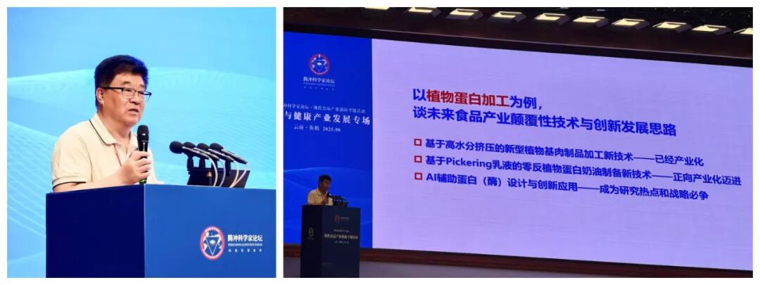 王强研究员作了题为“发展新质生产力 引领未来食品产业高质量发展”的主旨报告。报告系统阐释了新质生产力的内涵与外延、食品领域颠覆性技术和未来食品产业高质量发展创新思路。王强研究员强调未来食品产业高质发展需紧扣习近平总书记“整合科技创新资源,引领发展战略性新兴产业和未来产业,加快形成新质生产力”的指示要求,以创新为引领,加强颠覆性技术和前沿技术研究与关键核心技术协同创新,催生新产业、新业态。他提出食品领域六大颠覆性技术,并结合团队最新研究成果,以植物蛋白加工为例,列举了三个例子阐述了颠覆性技术引领未来食品产业发展的创新思路。第一,基于高水分挤压的新型植物基肉制品加工新技术:揭示了高水分挤压过程中蛋白质多尺度结构变化与纤维结构形成机理,创新了挤压关键工艺与“螺杆构型”、“模具”等核心装备,实现了高水分挤压制备植物基肉制品的链式创新与突破,建立了千吨级高水分挤压植物基肉制品产业化生产线,开发出植物基牛肉、猪肉、鸡肉和鱼肉4大类10余种等新产品,成果获2024年全球食品工业奖(Global Food Industry Awards)、2025年第50届日内瓦国际发明展金奖。第二,基于Pickering乳液的零反植物蛋白奶油制备新技术:团队突破了可产业化的植物蛋白Pickering微凝胶颗粒制备工艺,建立了基于Pickering乳液的零反植物蛋白奶油制备新技术,研发出零反式脂肪酸植物蛋白奶油新产品;探明了新型植物蛋白奶油流变特性与3D打印关联机制,明晰了核心组分对新型植物蛋白奶油3D打印效果的影响,建立了基于新型植物蛋白脂质奶油配套3D打印技术。第三,基于AI辅助蛋白(酶)设计与创新应用:以植物蛋白凝胶颗粒为载体制备固定化酶Pickering颗粒,催化体系可以提升催化效率15.4倍;团队利用AI和深度学习模型,辅助磷脂酶A1的定向进化,力争获得拥有自主知识产权的高活性、高稳定性的脱胶关键酶PLA1。最后,王强研究员总结到,3D打印、AI与智能制造等颠覆性技术一定会引领未来食品产业发展,其将为食品工业注入新活力、新动能,并催生一批新产业、新模式、新业态。